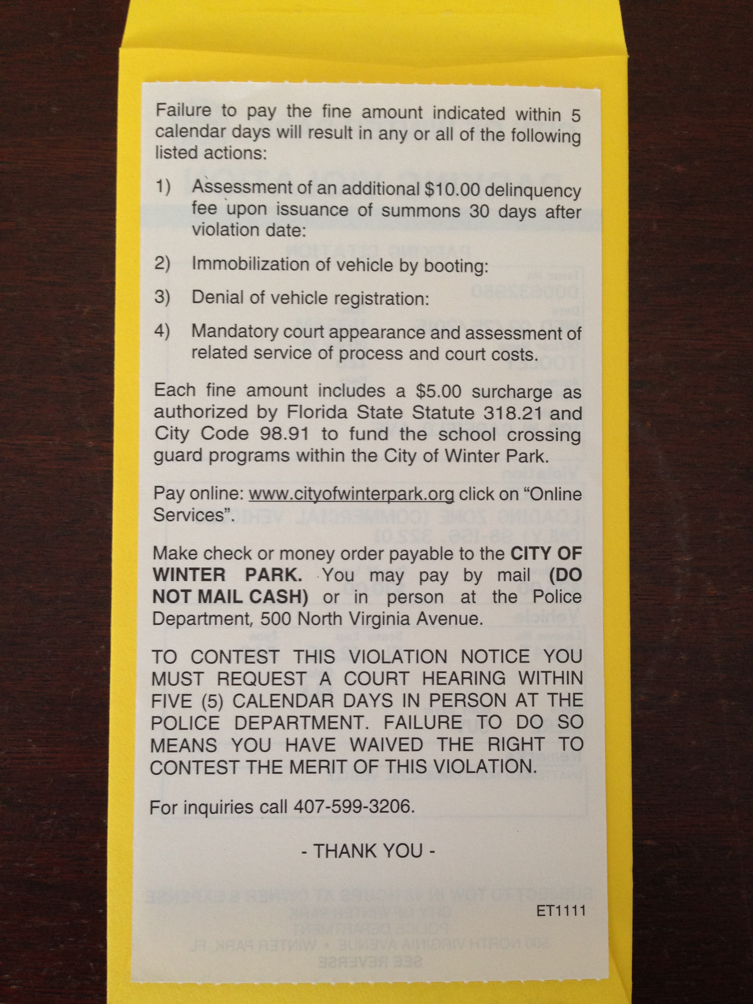 This is what the back of a Winter Park, Fla. parking ticket looks like. Notice how you get only five calendar days to contest the citation, and in order to do so, you must show up in person at a police station. Notice too the “Thank You” at the bottom of the citation. At least the parking enforcement unit tax collectors in Winter Park are polite about stealing your money.