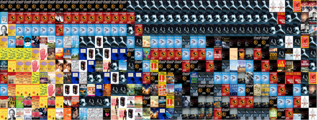 | Via the excellent Ana Swanson, this image visualizes the Top-10 Best-Sellers (via their hardback book covers) for most of 2012. Each column (left to right) represents 1 week; 1st place is up on top, while 10th place is on the bottom. Courtesy of James Davenport. Check out his cool blog “If we assume.” |