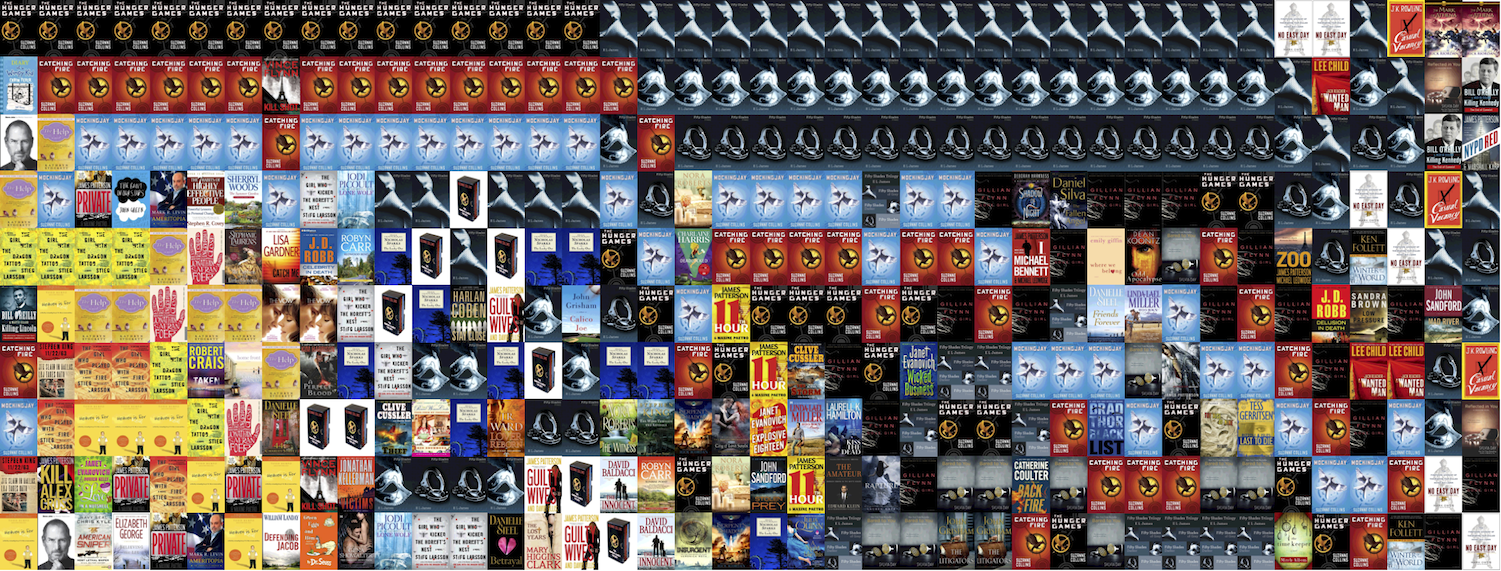 | Via the excellent Ana Swanson, this image visualizes the Top-10 Best-Sellers (via their hardback book covers) for most of 2012. Each column (left to right) represents 1 week; 1st place is up on top, while 10th place is on the bottom. Courtesy of James Davenport. Check out his cool blog “If we assume.” |