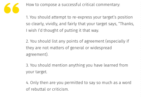 We recently stumbled upon this short post by Maria Popova (“How to criticize with kindness”) explaining philosopher Daniel Dennett’s “four rules” of fair-minded, scholarly criticism. In brief, before you begin to refute or criticize someone else’s ideas, you should do three things first: