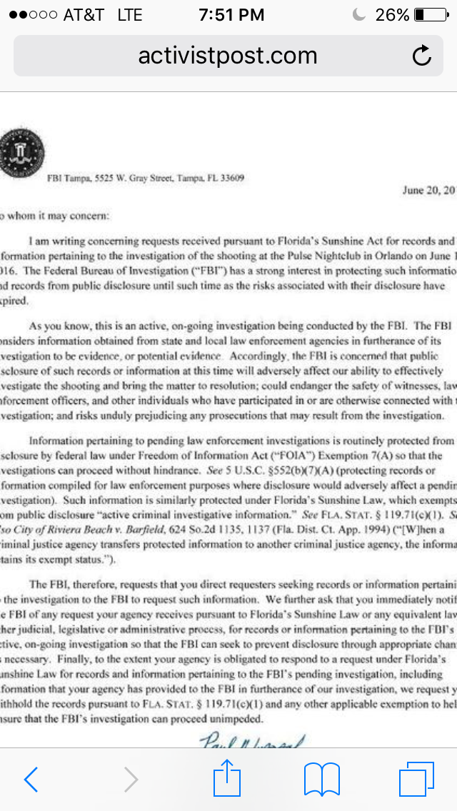 Hey, what are the FBI and the Orlando police trying to hide from the public in connection with the massacre at Pulse nightclub last month? The police’s slow response to the Pulse shootings (it took the police over three hours to rescue the remaining hostages that night)? Under Florida sunshine laws, 911 phone calls are public records and must be released to the public, yet Orlando police–apparently at the request of the FBI (see letter below the fold)–is still refusing to release all but one of the transcripts of the 911 phone calls made during the Pulse shootings last month, and even the one phone record that was released was originally censored, with all references to Allah and the Islamic State redacted. Isn’t this sorry episode yet another textbook example of the police acting above the law?