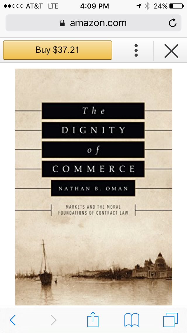 We have been attending the 12th Annual International Conference on Contracts (KCON XII) at Southwestern Law School in downtown Los Angeles this weekend (fun!). One of our favorite talks at the conference was by Nathan Oman, a law professor at the College of William & Mary, who presented his new book The Dignity of Commerce: Markets and the Moral Foundations of Contract Law (U Chicago Press, 2017). In summary, Professor Oman argues that the main purpose of the law of contracts is to promote commerce and well-functioning markets. Moreover, he claims that markets are morally desirable in and of themselves. Why? Because markets not only promote economic efficiency (i.e. the allocation of assets to their highest valued uses); markets also facilitate social cooperation and communal harmony. Specifically, markets enable people to serve the needs of others and cooperate in mutually beneficial ways even in the absence of political, religious, or ideological agreement. (This last point–the ability of markets to meet human needs and bring diverse and self-interested actors together–deserves more attention in the legal academy.)