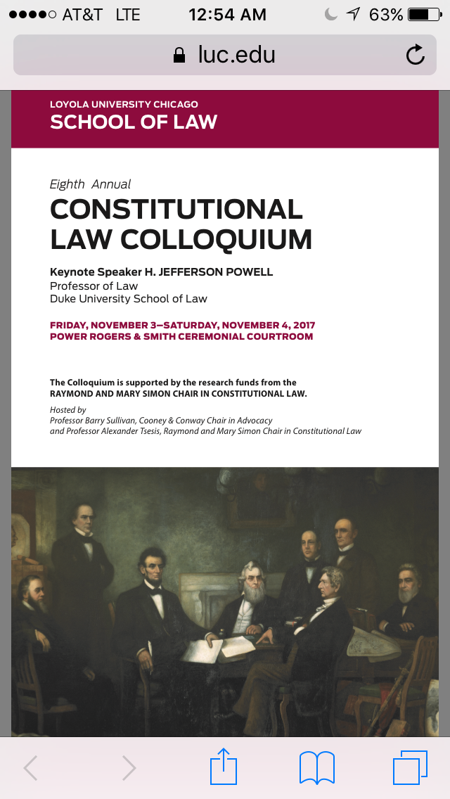 Updated 11/5 (9AM): We’re attending the eighth annual constitutional law colloquium at Loyola Law School in Chicago, where we are presenting our work-in-progress on “Bayesian voting.” So far, our favorite paper presented at the colloquium is Donald Kochan’s work on the “framing” or labeling of constitutional rights. (We are intrigued by his thesis and will be reading his paper on our return flight home tonight.) In addition, honorable mentions go to (1) Paul Gowder’s talk on constitutional collective action (“Beyond the arab spring: digital collective action and the rule of law”), (2) Eang Ngov’s talk on “Police ignorance and mistake of law,” and (3) Mihailis Diamantis’s talk on limiting the scope of the third party doctrine in Fourth Amendment cases. We will be posting more details about these talks soon.