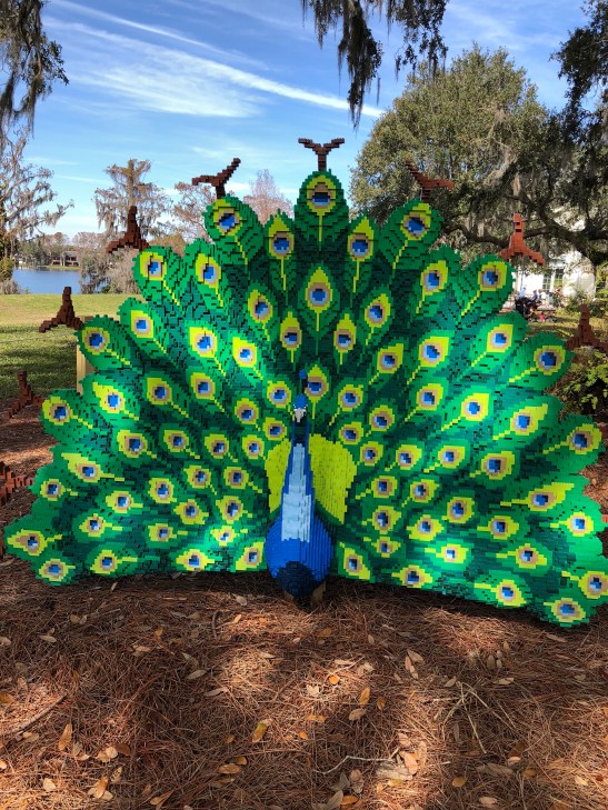 We’ve shared many examples of “Lego Art” in previous blog posts (see here). This spring, 13 new works of LEGO art are on display at Leu Gardens in Orlando, Florida. These works are by Lego artist Sean Kenney. (Check out his website here.) The peacock pictured below contains 68,827 Lego bricks.
