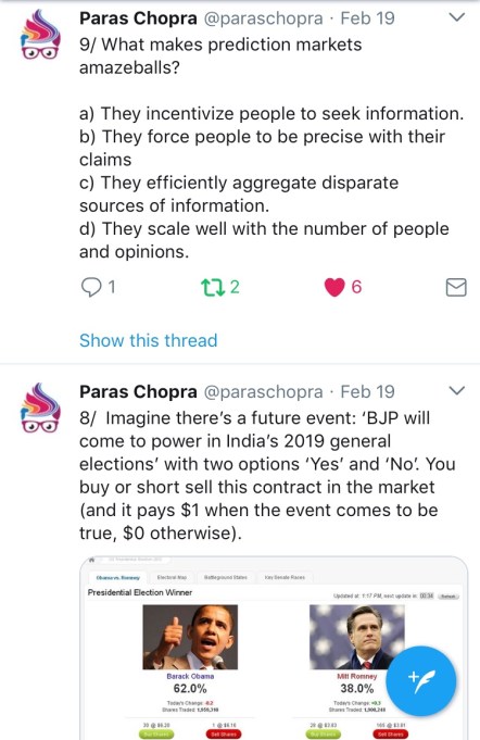 Via Twitter (@paraschopra), check out this excellent explanation of prediction markets (PMs) by our new friend Paras Chopra. This thread consists of 27 tweets in all; for your reference, below is a screenshot of tweets nine and eight: