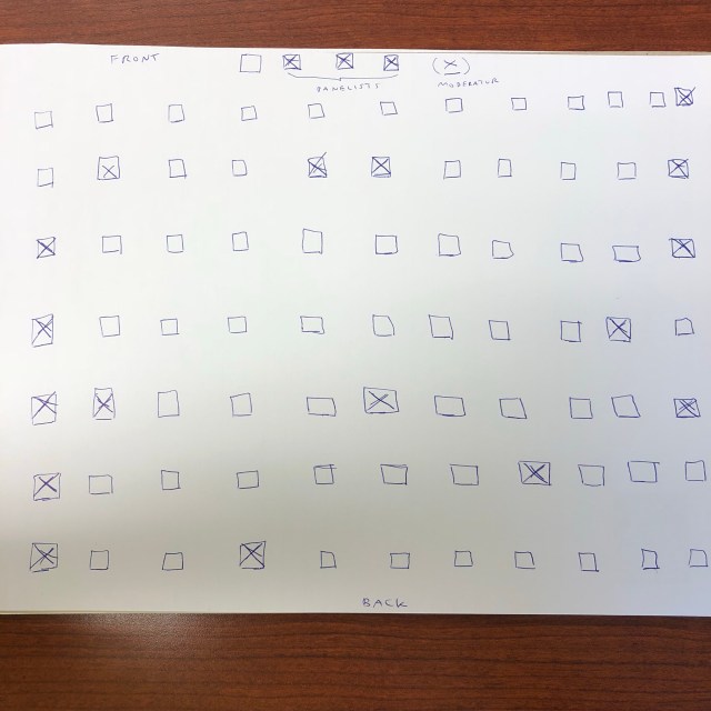 See image below. A box with an X indicates an occupied seat, while empty boxes indicate empty seats. When there are more spaces (chairs) than audience members, why do law professors prefer sitting at both ends of a room rather than the middle of the room?