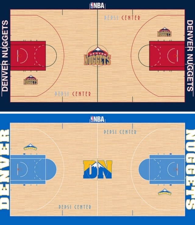 Via kottke, we discovered this comprehensive database of 1,157 NBA hardwood courts complied by Flickr user kodrinsky. His online collection includes pro-basketball courts for every NBA team dating back to the 1950s, and it documents changes in arena names, team logos, free-throw lane layouts, paint schemes, sponsors, and even wood patterns! Below, by way of example, are the courts for the Denver Nuggets from the 2003-04 and 2004-05 seasons.