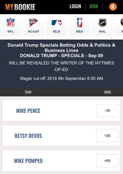 Is the op-ed a hoax, or is there really a presidential nanny in the White House? According to one prediction market (see screenshot below), the top three suspects are VP Mike Pence, Education Secretary Betsy DeVos, and Secretary of State Mike Pompeo. You can place your bets on this website (mybookie.ag). But hurry, you have until 9 September to place a bet!