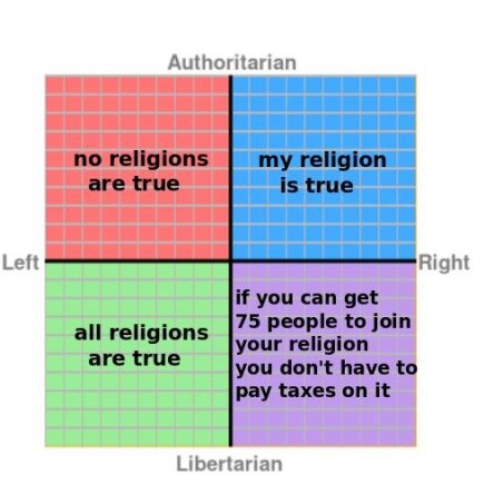 While I do not consider myself “authoritarian” these compartments are pretty good. I think also that the four “axes” are confounded — left and right incorporate aspects of libertarian and authoritarian. A good intellectual challenge would be to come up with two socio-political-economic axes that are not confounded. For example, “Haves vs Have-Nots” is not orthogonal to “Secure vs Insecure” or “Altruistic vs I Got Mine”.