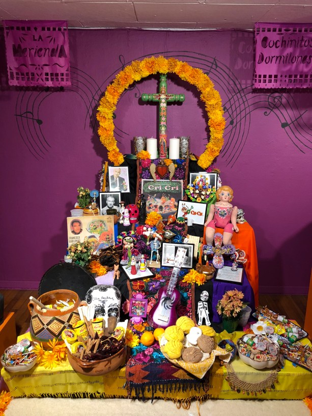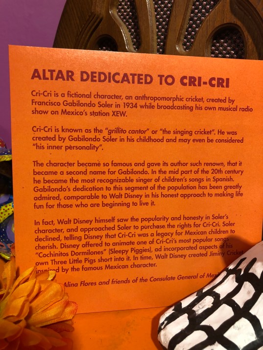 One aspect of Mexican culture that has always fascinated me is the custom of making ofrendas to honor the dead. (An ofrenda is a collection of physical objects–some sacred, others profane–placed on a ritual display, usually during the annual “Dia de los Muertos” celebration every 2 November, and many ofrendas are quite large and elaborate.) The Mexic-Arte Museum in Austin, Texas contains, among other things, an eclectic collection of ofrendas. Most of the museum’s ofrendas honor actual persons, but the one below honors Cri-Cri, a beloved Mexican cartoon character!