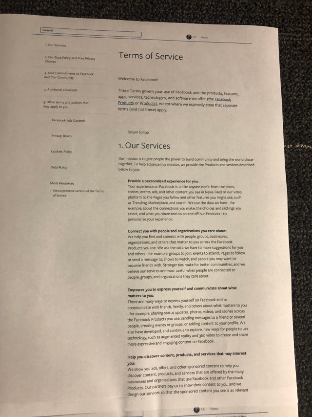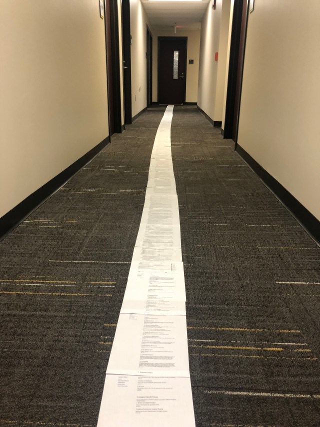 I printed out Facebook’s terms of service (10 point font or smaller) and attached all the pages together into a single master document, eliminating all blank spaces. (The picture on the bottom shows the first page of this massive undertaking.) Then I took this picture of this enormous monstrosity: