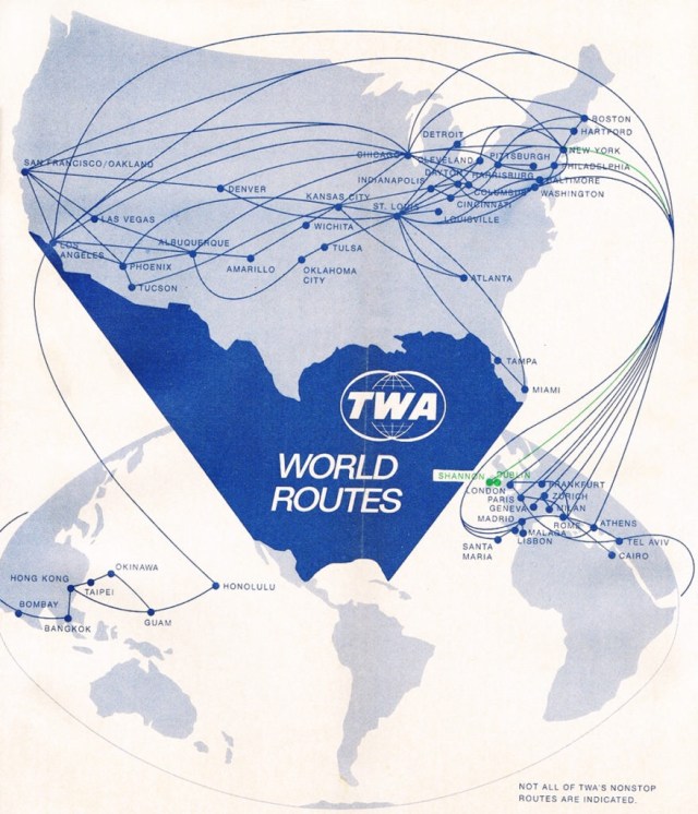 Check out this excellent essay by Andy Murdock on the history and aesthetics of airline route maps. By way of example, below are the route maps of two defunct airlines, National Airlines and TWA.