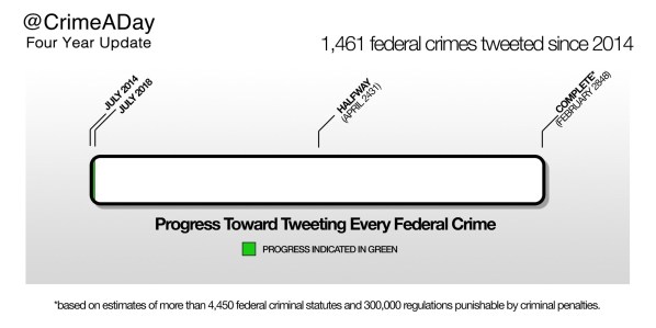 The problem is, federal law has grown into an ugly monster, an unruly beast. The actual number of federal laws, let alone federal regulations, is so large that no one knows for certain the total number of extant federal crimes! By way of example, when the corpus of federal laws was first codified in 1927, all the laws that the Congress had enacted could fit into a single volume. By the 1980s, however, the United States Code had expanded to 50 separate volumes containing over 3000 separate federal crimes. And today? According to @CrimeADay (a popular legal Twitter account devoted to keeping this tally), no one knows for sure. So, how could I possibly tame this massive federal legal beast?
