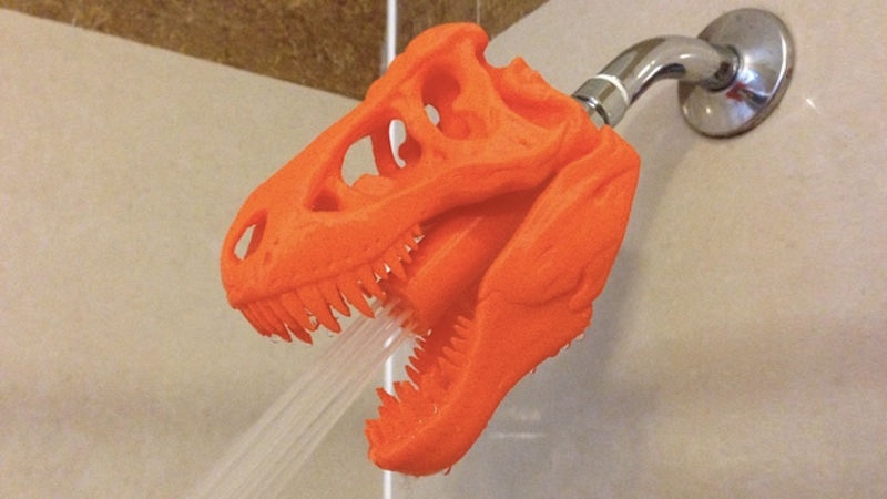 Check out the 3D-printed T-Rex shower head pictured below, which is available for download for free from MakerBot’s Thingiverse. Hat tip: @pickover.
