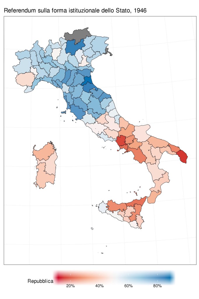 The Two Italies: how Italians voted in 1946 to choose between Republic (Blue) and Monarchy (Red).