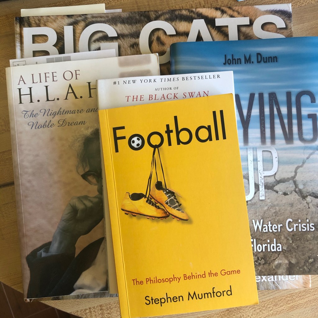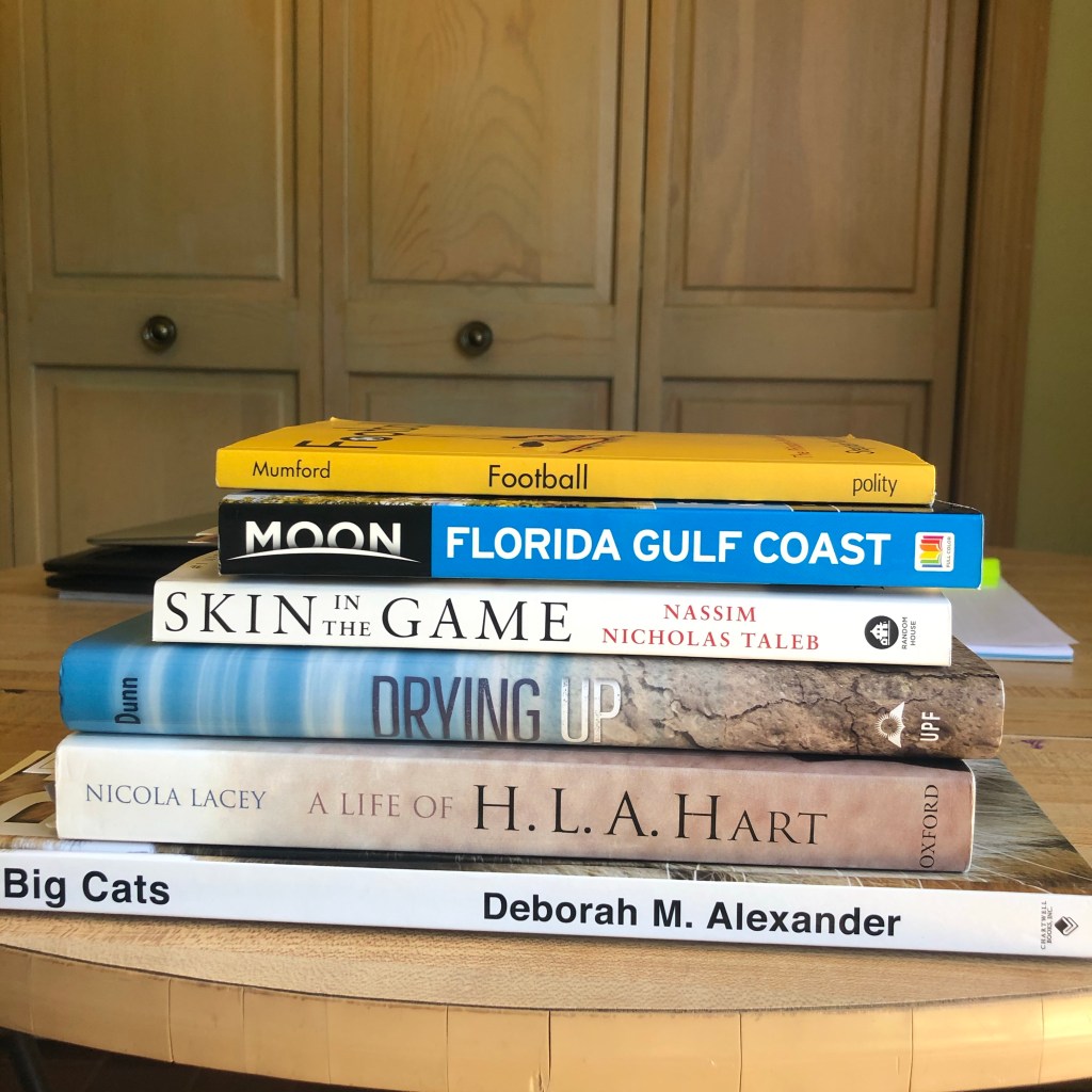 I still have two full weeks before I have to go back to teaching, so I am making the most of my time by catching up on my readings. Among the many things I have learned is that the great H.L.A. Hart did not have an advanced law or philosophy degree and did not begin teaching until he was almost 40! For his part, Nassim Nicholas Taleb is an insufferable bore, but his “Skin in the Game” book is very relevant to our current “cancel culture” troubles, while the coffee-table book on “Big Cats” not only contains many beautiful photographs of lions, leopards, tigers, etc.; it also describes their evolutionary history, mating practices, eating habits, and other forms of behavior. Lastly, the Moon “Florida Gulf Coast” travel book is for a family beach vacation I am planning for next week, and I will have more to say about the other books in my pile soon …
