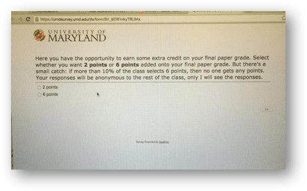 You can each earn some extra credit on your term paper. You get to choose whether you want 2 points added to your grade, or 6 points. But there’s a catch: if more than 10% of the class selects 6 points, then no one gets any points. All selections are anonymous, and the course grades are not curved.[1]