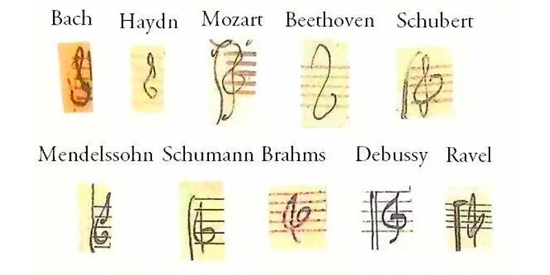 The illustration pictured below (hat tip: @pickover) shows how ten of the most famous classical music composers drew their “Treble Clef” symbols: