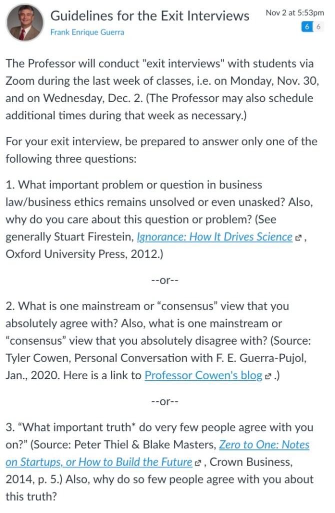 Instead of a final exam, why not conduct “exit interviews” with our students? That’s exactly what I have decided to do to conclude my course on Advanced Topics in Business Law. For your further reference, below is a screenshot of my exit-interview guidelines: