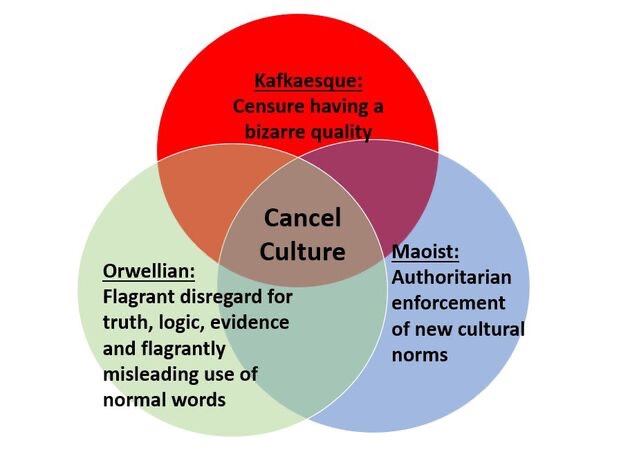 The venn diagram presented above does an excellent job of displaying the ideologies comprising “Cancel culture”. The Kafkaesque component of was one that didn’t even occur to me. Whereas the Orwellian and Maoist elements were much more obvious to me.