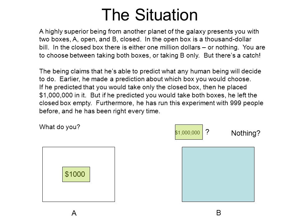Paradoxes have always fascinated me, and one of the philosophical puzzles that has captured my imagination the most is a probabilistic problem called Newcomb’s paradox (see image below). With this background in mind, I recently stumbled across a 2020 paper by Adam Elga (Princeton) titled “Newcomb University: A Play in One Act.” Professor Elga’s excellent paper explores in depth two variants of this paradox and identifies some salient weaknesses with some of the leading approaches to this philsophical/probabilistic problem. For my part, I would like to pose a seemingly childish question, Can we all agree that this paradox cannot be solved, that there is no “right answer”? In other words, isn’t that the main point or lesson of this particular paradox: that some problems are simply unsolvable? That, at least, is the position I take in my work-in-progress titled “Judge Hercules or Judge Bayes?