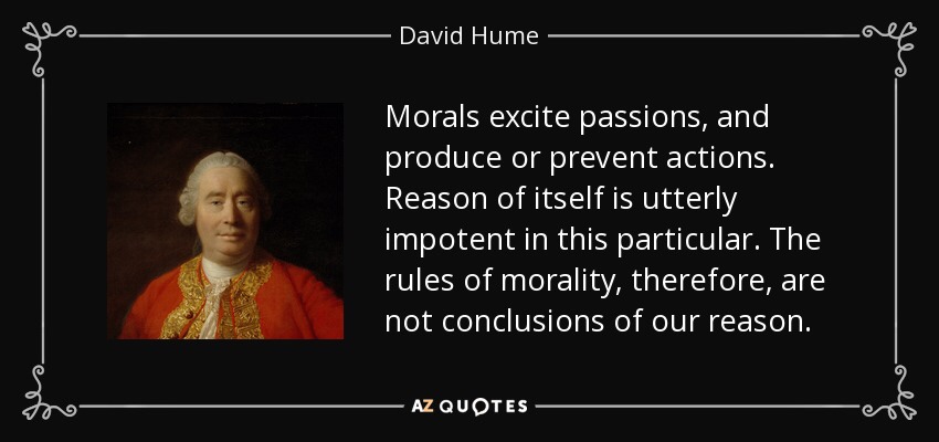 Before we discuss the main features of Adam Smith’s approach to moral philosophy (sympathy or fellow-feeling, the imaginary impartial spectator, and virtue), I want to share with you two quotes by David Hume: one about the limited role of reason in matters of morality; the other on Hume’s famous “is-ought” distinction, i.e. the notion that facts and values are two different domains. In many ways, Smith’s Theory of Moral Sentiments can be seen as an extended reply to Hume. (An in-depth survey of Hume’s moral philosophy can be found here.)