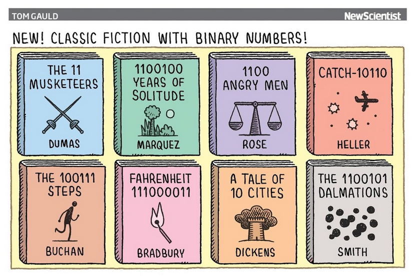 Imagine if the Arabic numerals in your favorite book were replaced with binary numbers … (Via Wikipedia: In mathematics, a binary number is a number expressed in the base-2 numeral system or binary numeral system, which uses only two symbols: typically “0” and “1”.)