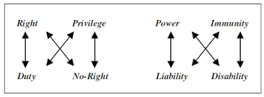 [1] See generally Hohfeld (1913). In brief, Professor Wesley Newcomb Hohfeld had noticed the ubiquity of “rights” talk in law. Among other things, he noticed that the word “right” can have several different meanings, and he created a comprehensive taxonomy of “jural opposites” and “jural correlatives” to explain the structure and logic of these different types of legal rights. Hohfeld’s influential analysis of the structure and logic of legal rights was further elaborated by Arthur L. Corbin (1919, 1921), and continues to be taught today. See, e.g., Nyquist (2002). Cf. Schlag (2015) p. 187: “One of the most striking aspects of Hohfeld’s work is how much its architecture and arguments remain relevant–even bitingly so.”