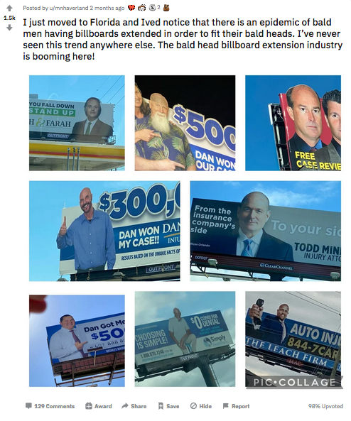 One of the minor irritations of living in Central Florida is the veritable orgy of annoying lawyer ads all over Orlando (#AdPorn). I always try to mentally block out these crass and ugly billboards whenever I am on the road, so I did not notice, as one newly arrived Floridian puts it, the “epidemic of bald men having billboards extended in order to fit their bald heads.” (Via Reddit: u/mnhaverland.)