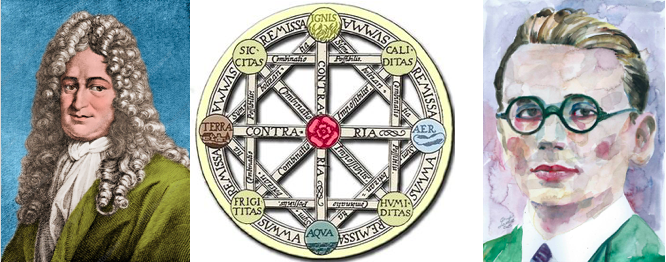 Left image: “Gottfried Wilhelm Leibniz, German Mathematician.” Source: Science Photo Library. Middle image: “Diagram of the Characteristica Universalis.” Source: Wikimedia Commons. Right image: KURT GODEL (Watercolor on Paper) by LAUTIR. Source: Saatchi Art.
