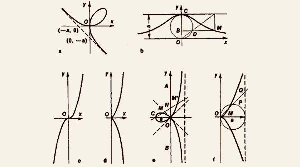 (a) Folium of Descartes, (b) Witch of Agnesi, (c) Cubical Parabola, (d) Semicubical Parabola, (e) Strophoid, and (f) Cissoid of Diocles