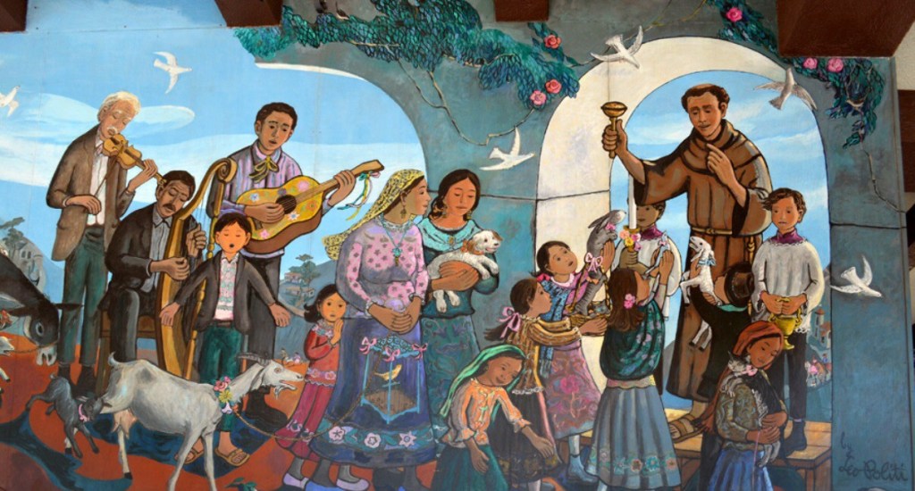 Today is the Feast Day of Saint Francis of Assisi. In his honor, pictured below is “The Blessing of the Animals” (1974-1978), a mural by Leo Politi, located on 125 Paseo de la Plaza in my hometown of Los Angeles, California. More details about this wonderful tradition and mural are available here.