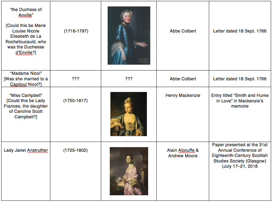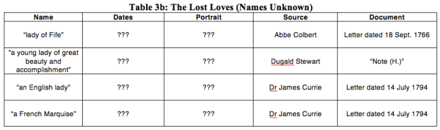 I made some additions and minor revisions to my three Adam Smith tables, so I am reblogging my previous post with the new and revised table. In brief, Table 1 summarizes in chronological order the secondary literature on Adam Smith’s love life, while Table 2 assembles the available evidence (also in chronological fashion). Additionally, based on the evidence set forth in Table 2, Table 3a identifies Smith’s possible lost loves by name. Lastly, Table 3b, by contrast, refers to those possible lost loves whose names are unknown.