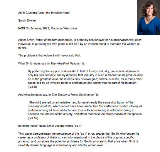 Moving on, the third of my three favorite talks at this year’s International Adam Smith Society (IASS) meeting was Sarah Skwire’s Saturday morning presentation (10/16/21) titled “As If: Clueless About the Invisible Hand“; in fact, I loved Dr Skwire’s beautiful paper so much that (starting tomorrow) I am going to devote my next few blog posts to it. For now, however, check out the introduction to Skwire’s IASS talk, which I am posting below (I have added a picture of Dr Skwire):