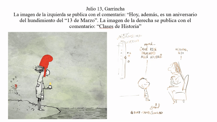 During the Thirteenth Conference on Cuban and Cuban-American Studies at FIU this past week, I discovered the work of Garrincha, which is the pen name of Gustavo Rodriguez, a Cuban-born artist who now resides in the USA. Both of his cartoons pictured below were published on 13 July 2021, two days after the unprecedented July 11 populist revolt in Cuba, which was brutally repressed by the Cuban military. The cartoon to the left refers to the 37 men, women, and children who drowned at sea when their vessel — the tugboat “13 de marzo” — was deliberately fired upon and destroyed by the Cuban Coast Guard on 13 July 1994, a crime that will live infamy. In the cartoon to the right, a child asks his mother what is going on outside. Her reply: “History, my son.”