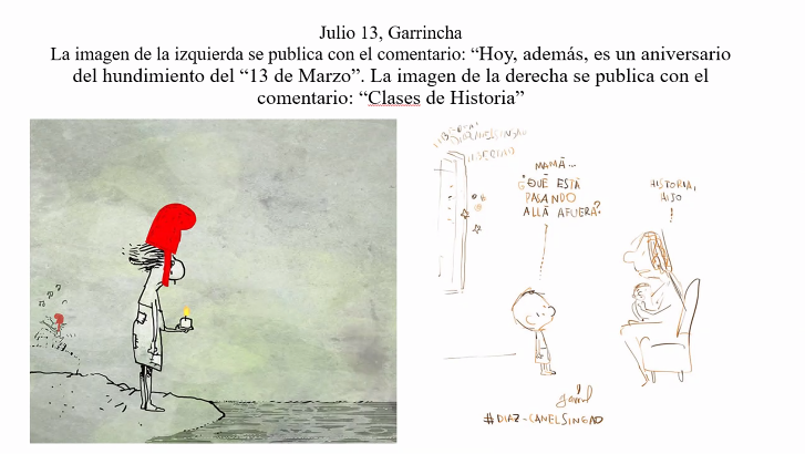 During the Thirteenth Conference on Cuban and Cuban-American Studies at FIU this past week, I discovered the work of Garrincha, which is the pen name of Gustavo Rodriguez, a Cuban-born artist who now resides in the USA. Both of his cartoons pictured below were published on 13 July 2021, two days after the unprecedented July 11 populist revolt in Cuba, which was brutally repressed by the Cuban military. The cartoon to the left refers to the 37 men, women, and children who drowned at sea when their vessel — the tugboat “13 de marzo” — was deliberately fired upon and destroyed by the Cuban Coast Guard on 13 July 1994, a crime that will live infamy. In the cartoon to the right, a child asks his mother what is going on outside. Her reply: “History, my son.”