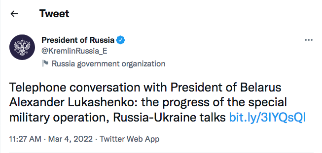 Remember when Twitter would slap warning labels on Donald Trump’s tweets? (If not, does this refresh your memory?) Not only has Twitter failed to ban war criminals like Putin from its platform; it is also allowing the Kremlin’s account to spread fake news with impunity — not a single “misleading information” or “glorification of violence” warning label in sight! Behold: