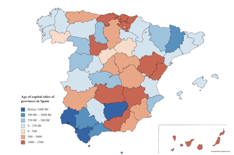 According to u/tywindevillena: The oldest provincial cities of Spain are Huelva, Cádiz, and Jaén: “Cádiz is frequently considered the oldest city in Europe. It was founded by the phoenicians, who named their settlement Gadir, somewhere in the 11th century BC.” Hat tip: u/fulanax.