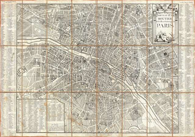 Via GetArchive (see here): “An extraordinary map of pre-Haussmann pre-Revolutionary Paris and the early Faubourgs (suburbs) issued in 1780, during the final decade of the French Monarchy. Covers Paris on both sides of the Seine from the Ecole Militaire to the Hospital de la Roquette, extends north as far as Montmartre and south roughly to Les Gobelins. Produced at the height of French dominance of the cartographic arts, this map is a masterpiece of the engraver’s art. Individual buildings, fields, streets, hills, valleys, orchards, and public gardens are revealed in breathtaking detail. We can even see the incomplete state of the northern wing of the Louvre Palace. There is an elaborate street index on either side of the map. An allegorical neoclassical title cartouche featuring war trophies appears in the upper right quadrant. This type of map, known as a pocket or case map, is designed with the traveler in mind and while it displays beautifully unfolded, is designed to fold and fit in a vest or coat pocket.”