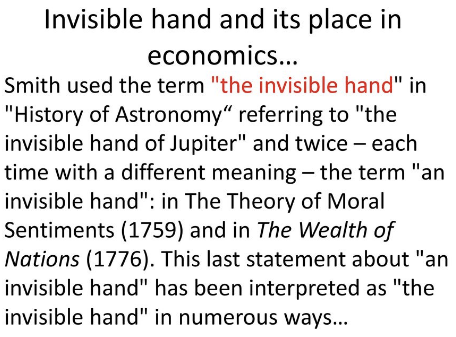 - Invisible hands. Adam Smith’s most famous metaphor has to be “the invisible hand,” a metaphor that appears in three of Smith’s works: in his essay on “The History of Astronomy”; in his treatise on moral philosophy (The Theory of Moral Sentiments); and in “Book I” of his work on The Wealth of Nations. Here, however, Professor Malloy commits a major mistake. Specifically, he fails to mentions that Smith uses his “invisible hand” metaphor in different ways in each one of these three works; as a result, we can’t say that Smith’s “invisible hand” metaphor has a single, stable meaning. (I could go into the nitty-gritty details here (see slide below), but I want to keep this blog post short, so just take my word for it for now.)