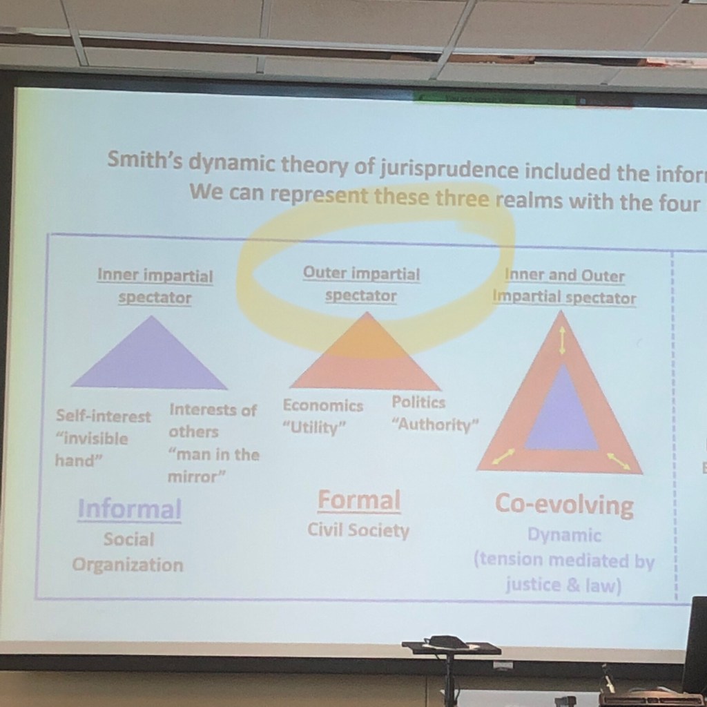 In summary, Smith’s “impartial spectator” was by definition an introspective and inward-looking inner being, an imaginary third party who enables each individual to objectively judge the morality of his actions. Although Smith’s original device of the impartial spectator was designed to be a purely introspective or inward-looking tool, why can’t this inner spectator expand his or her or its gaze toward the wider world around us? That is, in addition to judging the ethical status of one’s actions, what is preventing our “inner” spectators from becoming “external” ones, from judging the normative status of social norms, formal rules (laws), and other worldly things? In short, what Malloy does in these chapters that is so brilliant — an ingenious move that is at once plausible and promising — is to turn the direction of this spectator’s gaze outward, toward the external world itself!