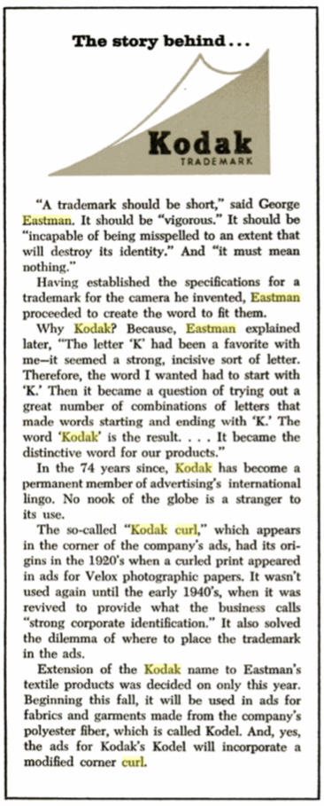 On this day (September 4) in 1888, North American entrepreneur George Eastman obtained a patent on his new camera (Patent No. 388,850), and the word “Kodak” was registered as a trademark (Reg. No. 15,825). Check out the evolution of the Kodak logo here. (P.S.: The oldest U.S. registered trademark still in use is this one (Reg. No. 11,210), which depicts the Biblical figure Samson wrestling a lion. That trademark was registered in 1884 by the J.P. Tolman Company.)
