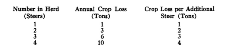In academic circles, one of the most famous legal narratives of all time is Ronald Coase’s cattle trespass story, or what one scholar has dubbed “the Parable of the Farmer and the Rancher.” In summary, Coase presents his farmer-rancher parable in his 1960 paper “The Problem of Social Cost” as follows: “Let us suppose that a farmer and a cattle-rancher are operating on neighboring properties. Let us further suppose that, without any fencing between the properties, an increase in the size of the cattle-rancher’s herd increases the total damage to the farmer’s crops.” In other words, although the rancher’s business is socially useful, his cattle-ranching activities may harm his neighboring farmer because stray cattle may often invade the farmer’s land and destroy the farmer’s crops. Coase also notes that this harm increases with the size of the rancher’s herd, and he illustrates the link between the magnitude of the externality and the size of the rancher’s herd with a simple arithmetical table (see below):