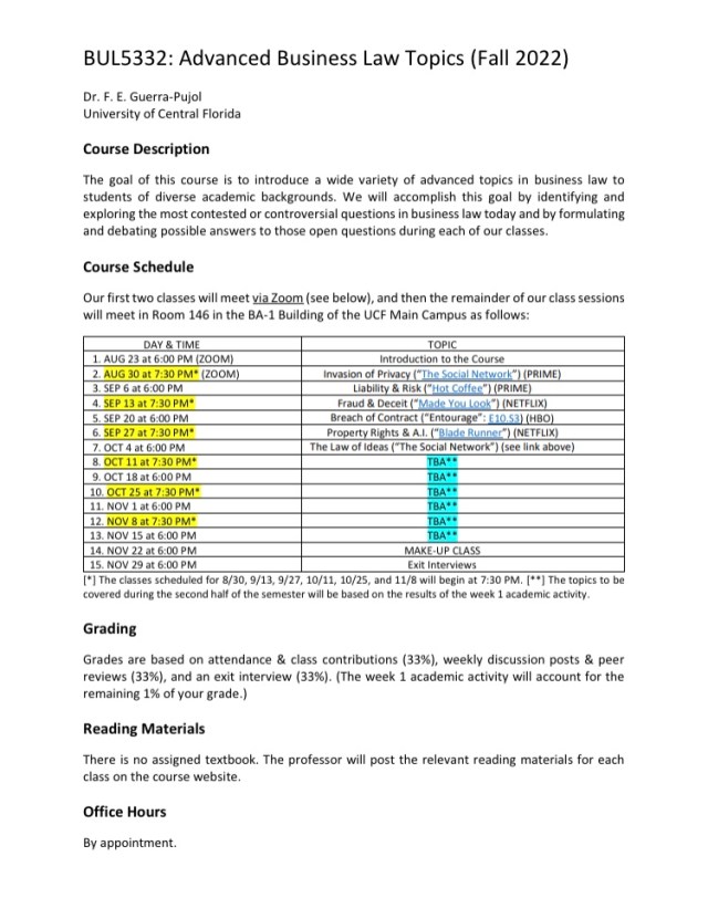 Below is my one-page syllabus for a graduate-level course on “advanced business law topics” that I will be teaching this semester. During the first half of the semester, I am assigning two movies, “The Social Network” and “Blade Runner“; two documentaries, “Hot Coffee” and “Made You Look” (shout out to my T.A. Antonella for recommending “Made You Look” to me); and an episode (see here) from season 3 of the series “Entourage”. My students will select the topics to be covered during the second half of the semester.