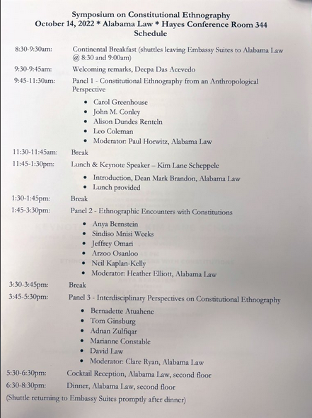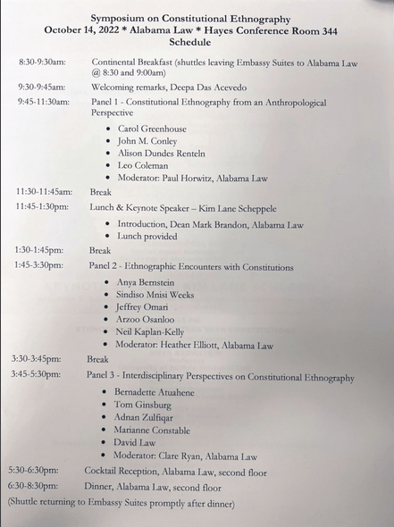 I finished reading “Wild Problems” by Russ Roberts yesterday and will post a review in the next day or two. In the meantime, I will be attending a symposium on Constitutional Ethnography at the University of Alabama today: Friday, 14 October. (P.S.: There is also a Zoom option; details here. P.P.S.: Here is a good introduction to “constitutional ethnography” authored by Kim Lane Scheppele, who teaches at Princeton.)