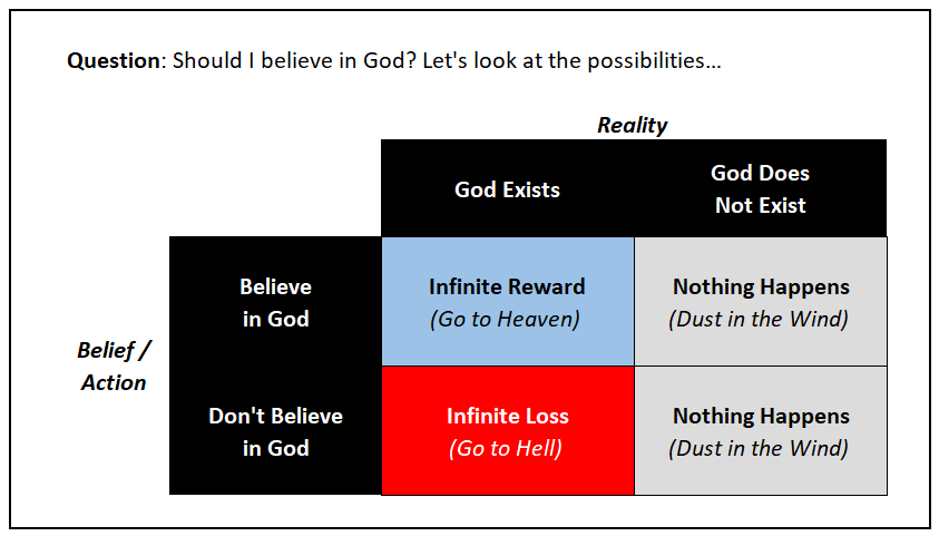 Check out this new paper by Saul Smilansky, who turns the tables on Pascal’s Wager (see also here and image below). In brief, Professor Smilansky’s argument is that God will be more upset at people who accept the wager (i.e. belief in God) but still commit moral transgressions than at atheists who reject the wager but live good moral lives. Although I am not buying Smilansky’s argument (since we are all sinners), it is worth reading and thinking about. Hat tip: Brian Leiter.