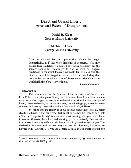 I recently stumbled upon this 2010 paper on “Direct and Overall Liberty” by Daniel B. Klein and Michael J. Clark, the first page of which is pictured below. How did I not discover their excellent paper before? Among other things, the authors identify 11 types of laws, regulations, and policies and provide a general framework for determining whether, on balance or “overall”, a proposed governmental action is pro-liberty or anti-liberty by comparing and contrasting two key variables: (a) the direct or immediate effects on liberty of the proposed measure, and (b) its indirect or long-term effects. (The authors also anticipate some objections to their framework and respond to additional objections in a follow-up paper they wrote in 2012. See here.)