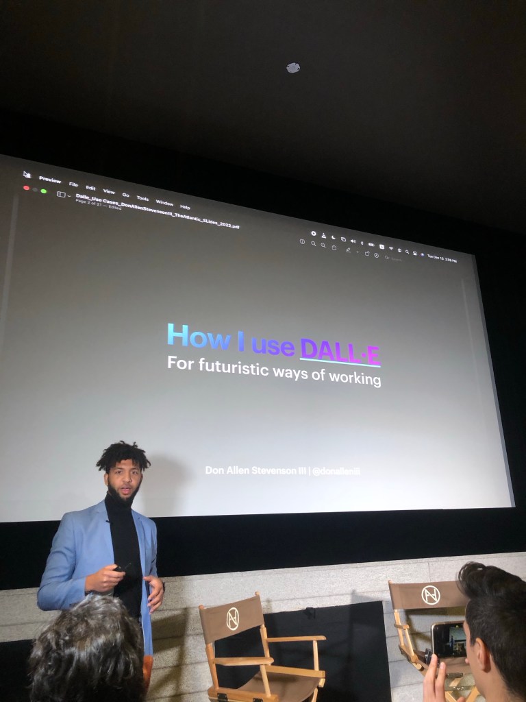 One of my favorite parts of Derek Thompson’s Progress Summit was the session on “How Artificial Intelligence Can Revolutionize Art and Creativity“, where Don Allen Stevenson III (pictured below) demonstrated “DALL·E 2” (see here), a new AI platform that can create realistic images and art from a description in natural language. I also liked Astro Teller’s talk on “moonshots”, which I will discuss further in my next post; in the meantime, below are some highlights from Mr Stevenson’s talk.