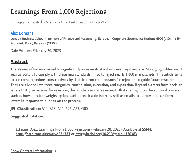 That is the topic of this new paper by Alex Edmans, a finance professor and the managing editor of the prestigious Review of Finance, the official publication of the European Finance Association. In a nutshell, Professor Edmans explains why he had to reject “nearly 1,000 manuscripts” for publication during his tenure at the journal. Below are just a few of his reasons for rejecting so many papers for publication: