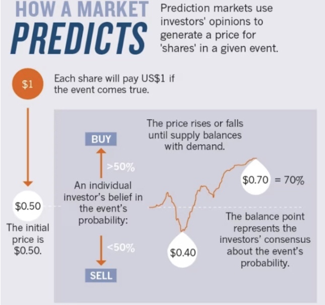 Simply put, my truth market would look like an existing prediction market such as Kalshi or PredictIt (see also the infogram pictured below) but with one major modification or tweak. First off, what is a prediction market? Broadly speaking, a prediction market is a market where people can trade “event contracts” that are tied to the outcome of an unknown future event. (By way of example: “Will Donald Trump be indicted before the end of this week?“) My tweak or modification, however, is to replace prospective event contracts with retrospective belief contracts.